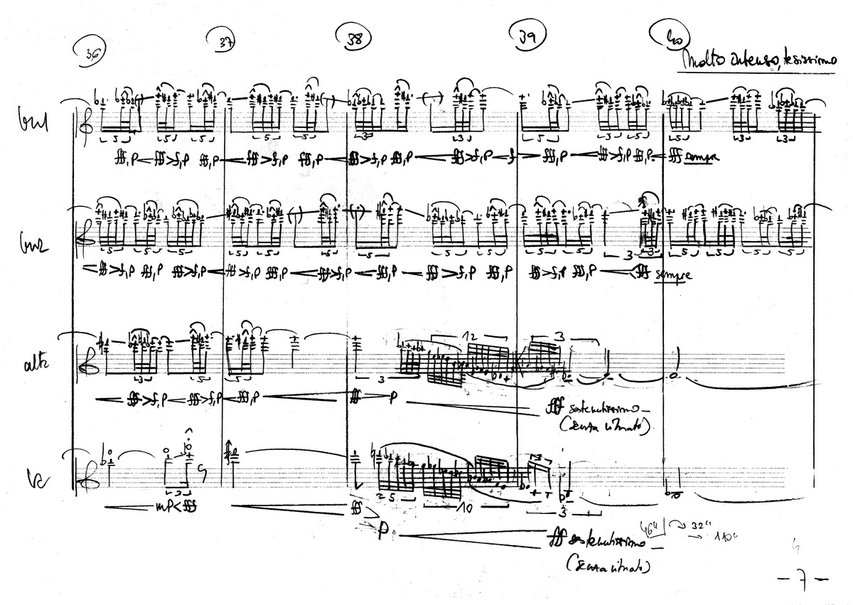 Q u a t u o r (n°1) (2005-2006), pour quatuor à cordes (20') → PDF [ 1 ] [ 2 ] Manuscrit [ 1 ]